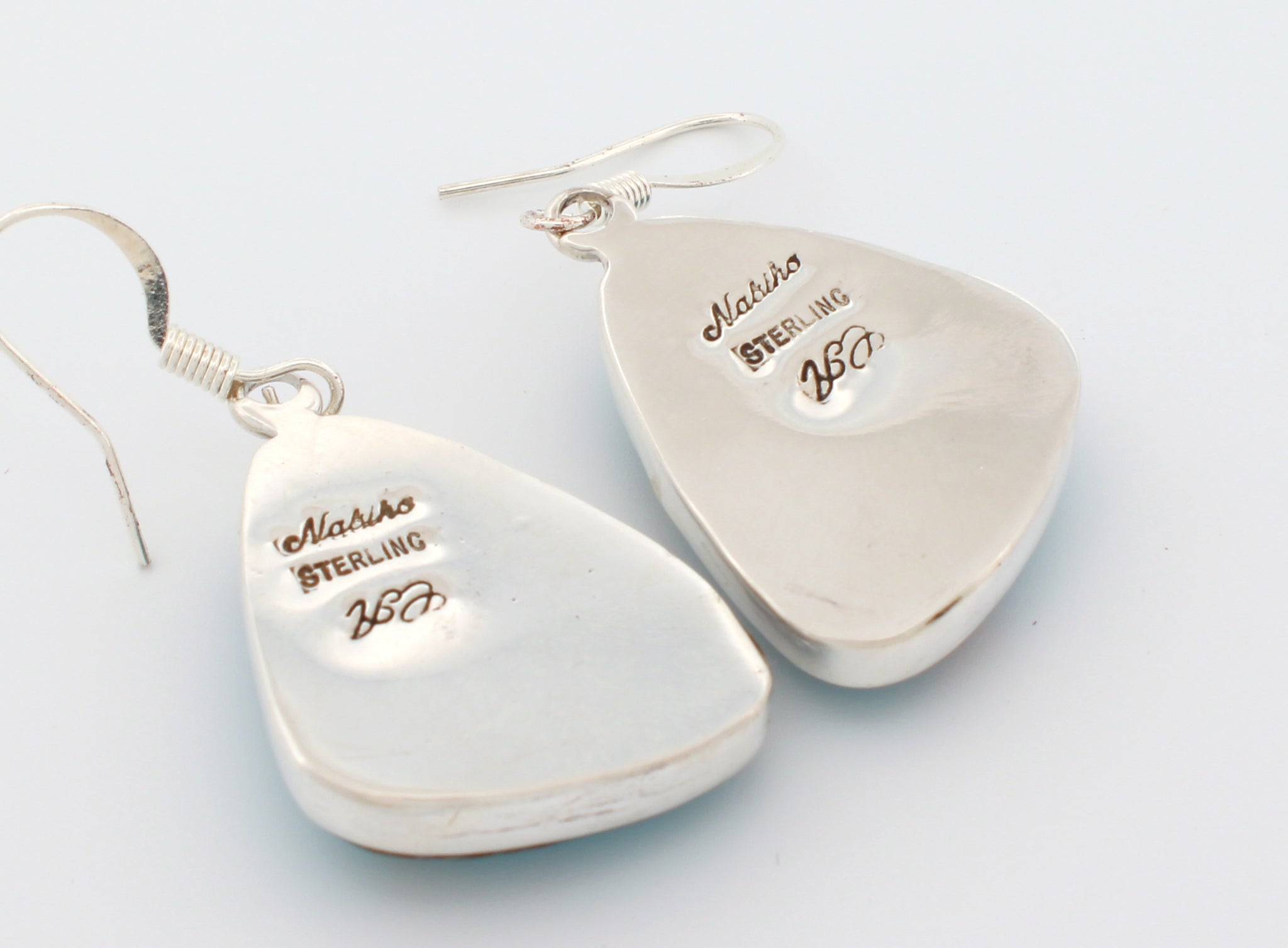 This is a pair of Navajo Native American handcrafted earrings by Caroline Apachito. These earrings are created with Armenian Turquoise and Sterling Silver. Both settings are signed by Caroline noted at CA Nabiho and are stamped Sterling.