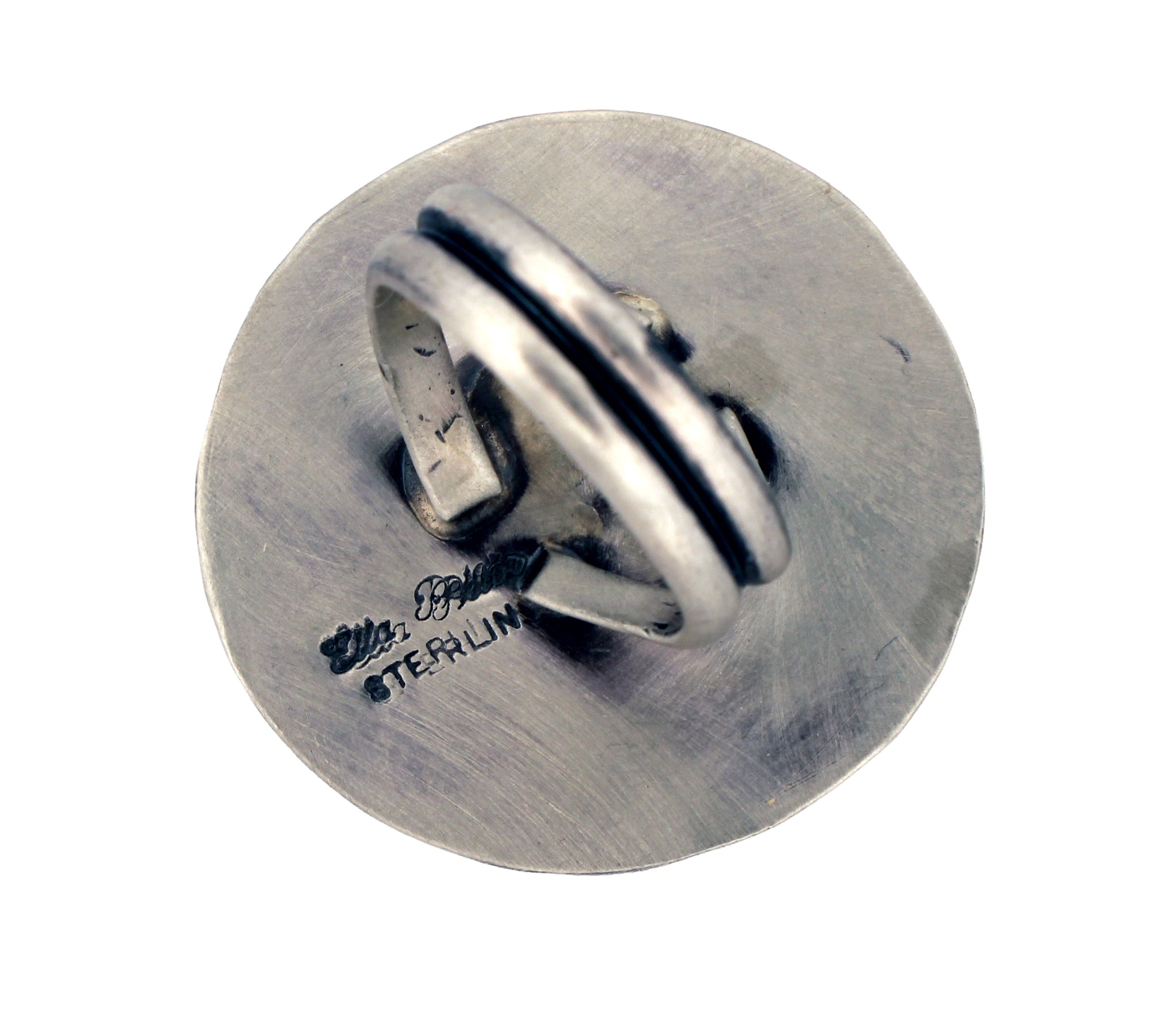 This is a Navajo Native American handcrafted ring size 7 by Ella Peters. This beautiful ring is created with Armenian Turquoise crafted with Sterling Silver. This piece is signed by Ella and is stamped Sterling.