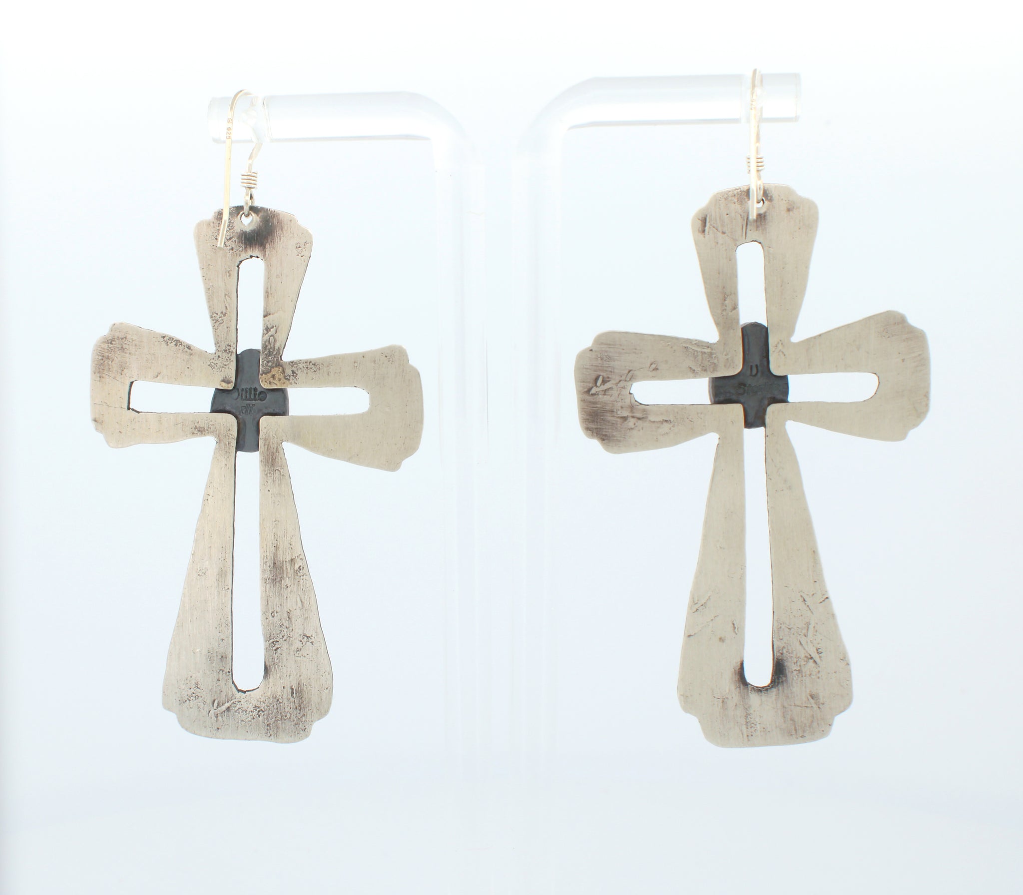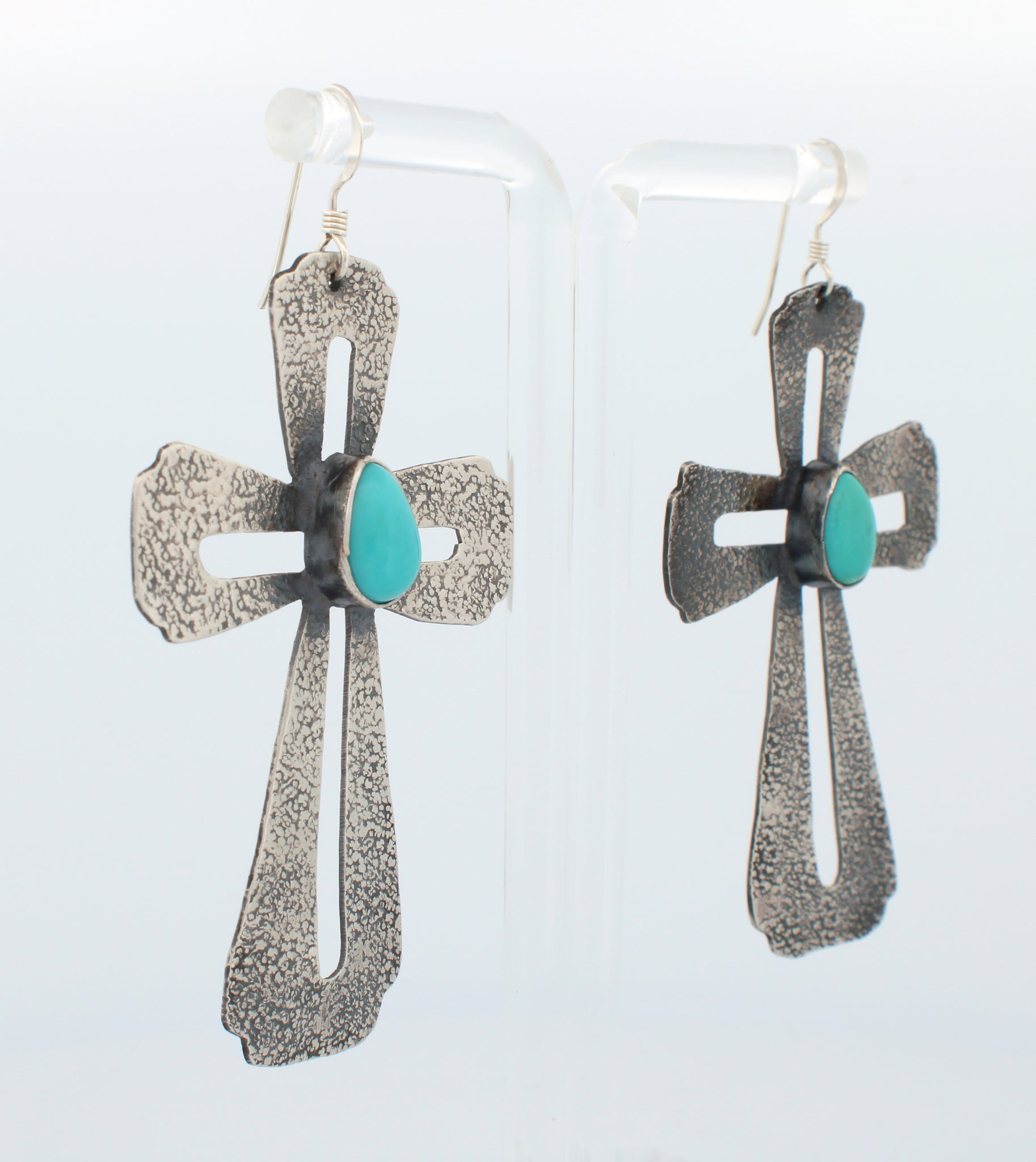This is a pair of Navajo Native American handcrafted earrings by Dakota Willie. These earrings are created with Compitos Mine Turquoise crafted with Sterling Silver. One Setting is signed Willie and the other is signed D and stamped Sterling.