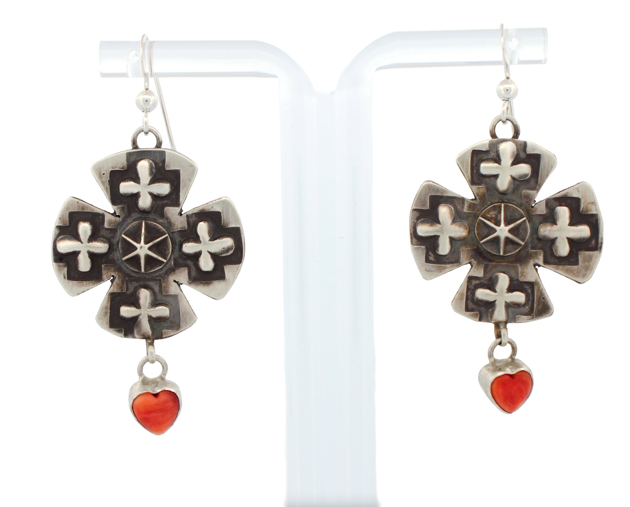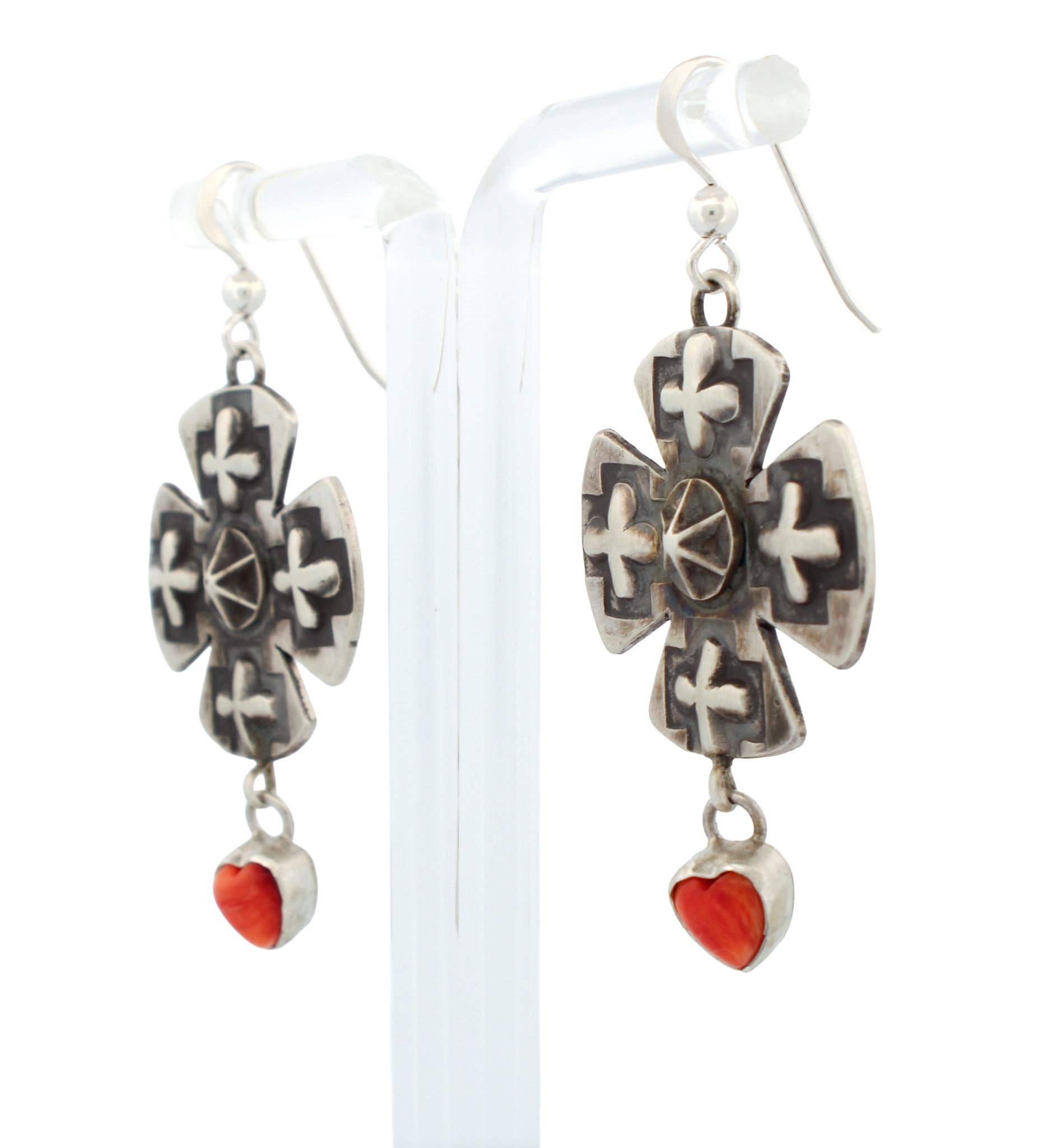 This is a pair of Navajo Native American handcrafted earrings by Dakota Willie. These Cross earrings are created with Spiny Oyster Shell and Sterling Silver. Both settings are signed by Dakota are stamped Sterling.
