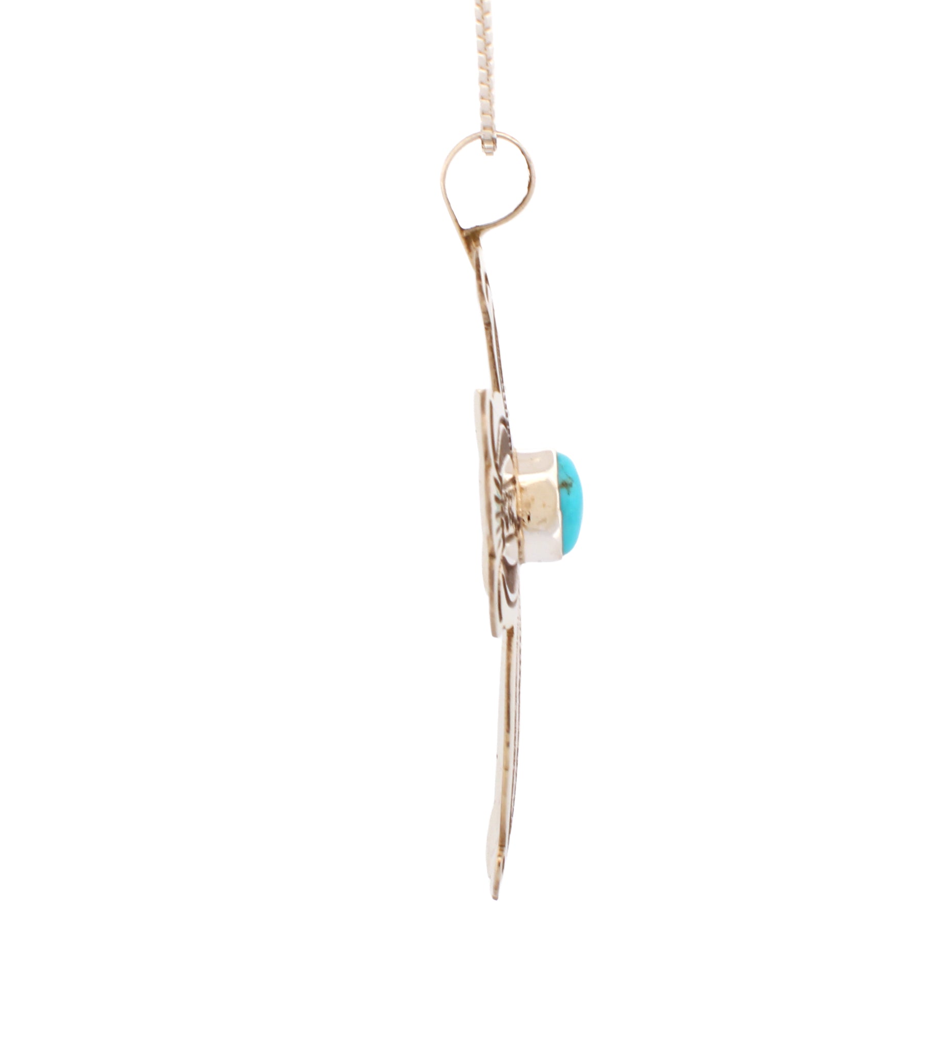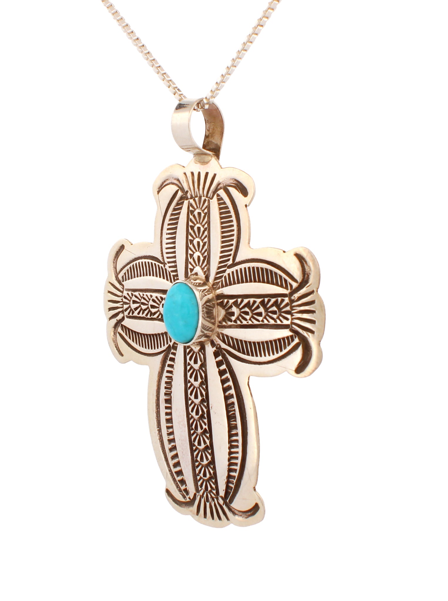This is a Navajo handcrafted Cross pendant by Arnold Blackgoat with necklace. This pendant is created with a center Kingman Turquoise stone crafted with stamped Sterling Silver. The pendant is signed by Arnold noted as BLKGT and is stamped Sterling.