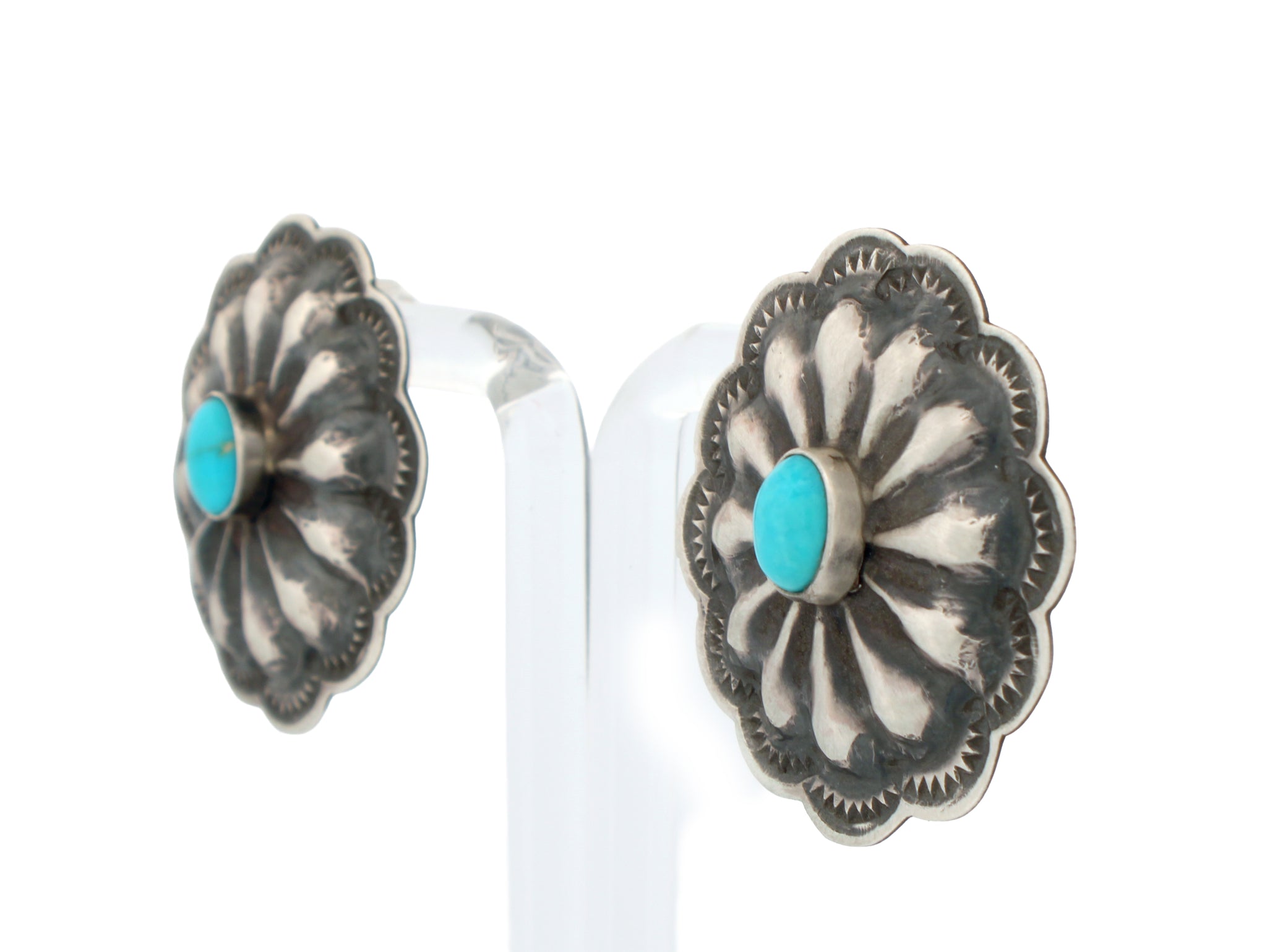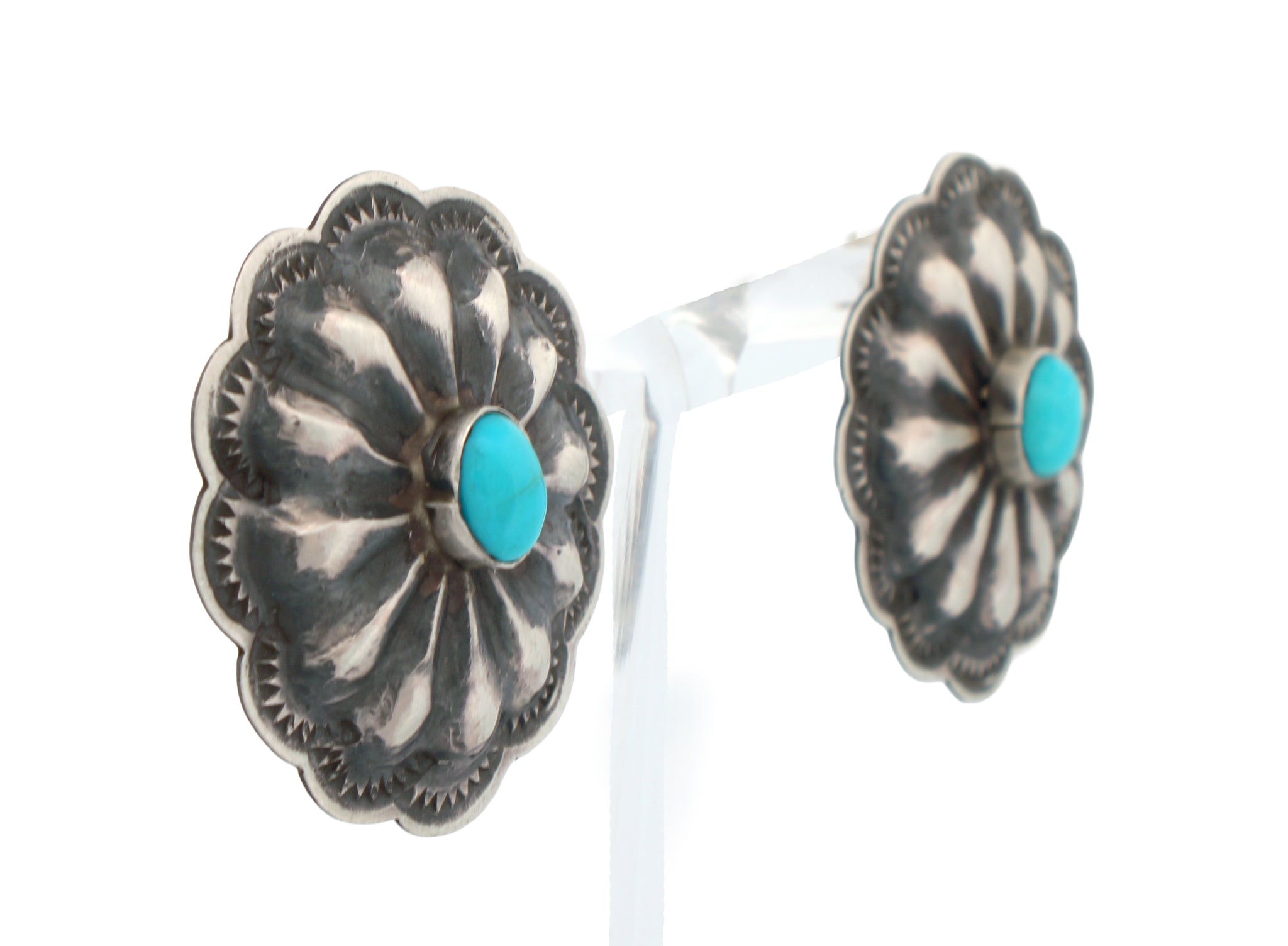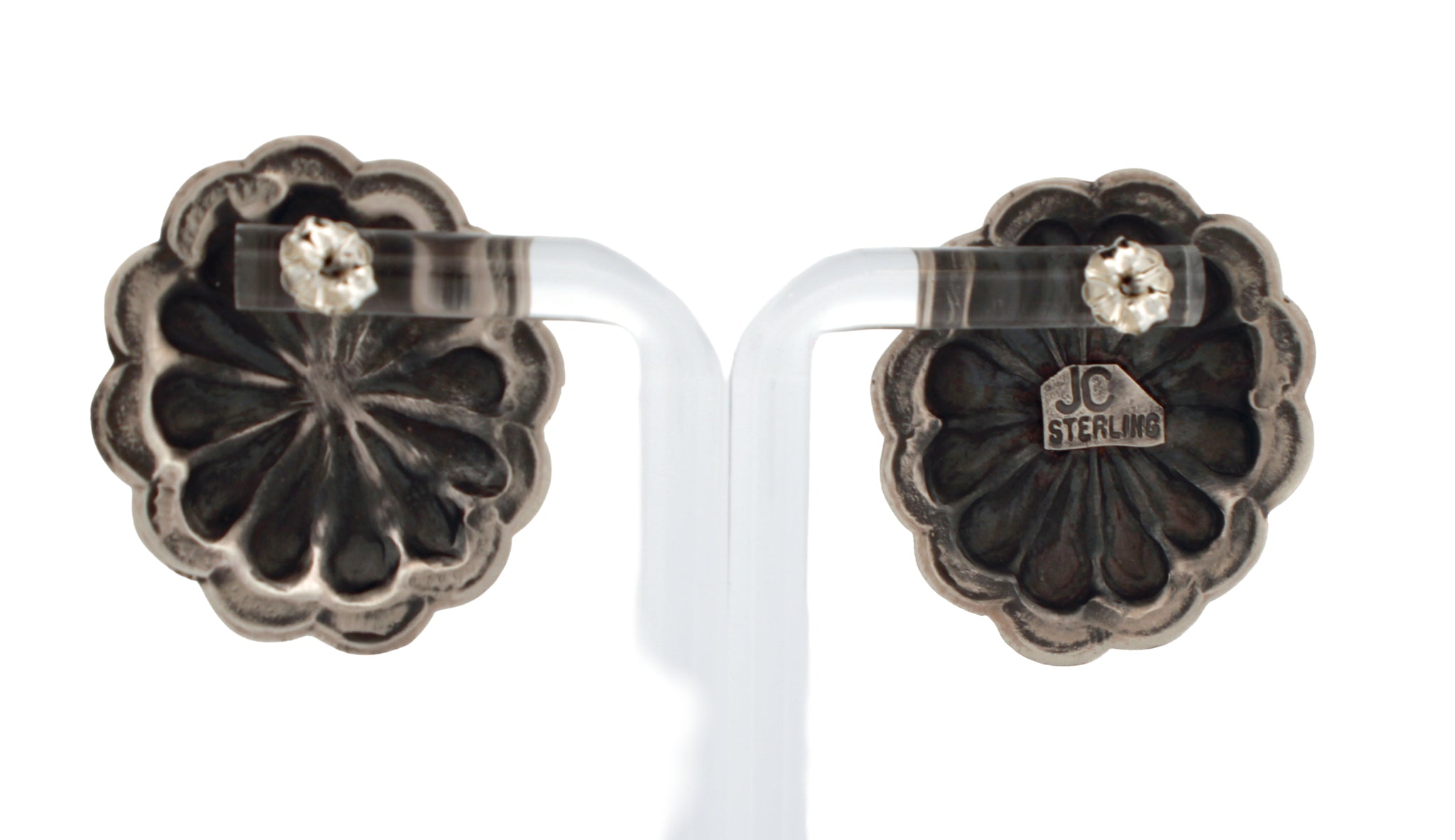 This is a pair of Navajo Native American handcrafted earrings by Tim Yazzie. These earrings are created with Repousse Sterling Silver.