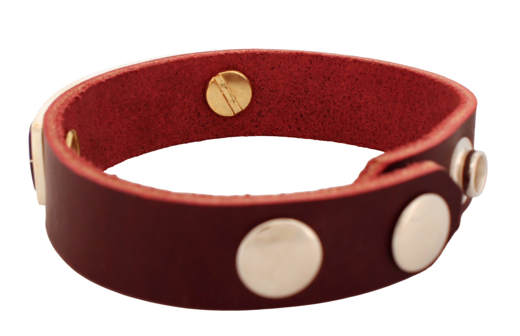The front sterling silver and inlay piece measures 2 5/8 inch side to side and is 5/8 inch top to bottom. The leather band snaps 9 inches at the longest and is 7 inches at the shortest. The middle size will comfortably fit a wrist that measures 7 inches. The Total weight of this piece is 29.9 grams.