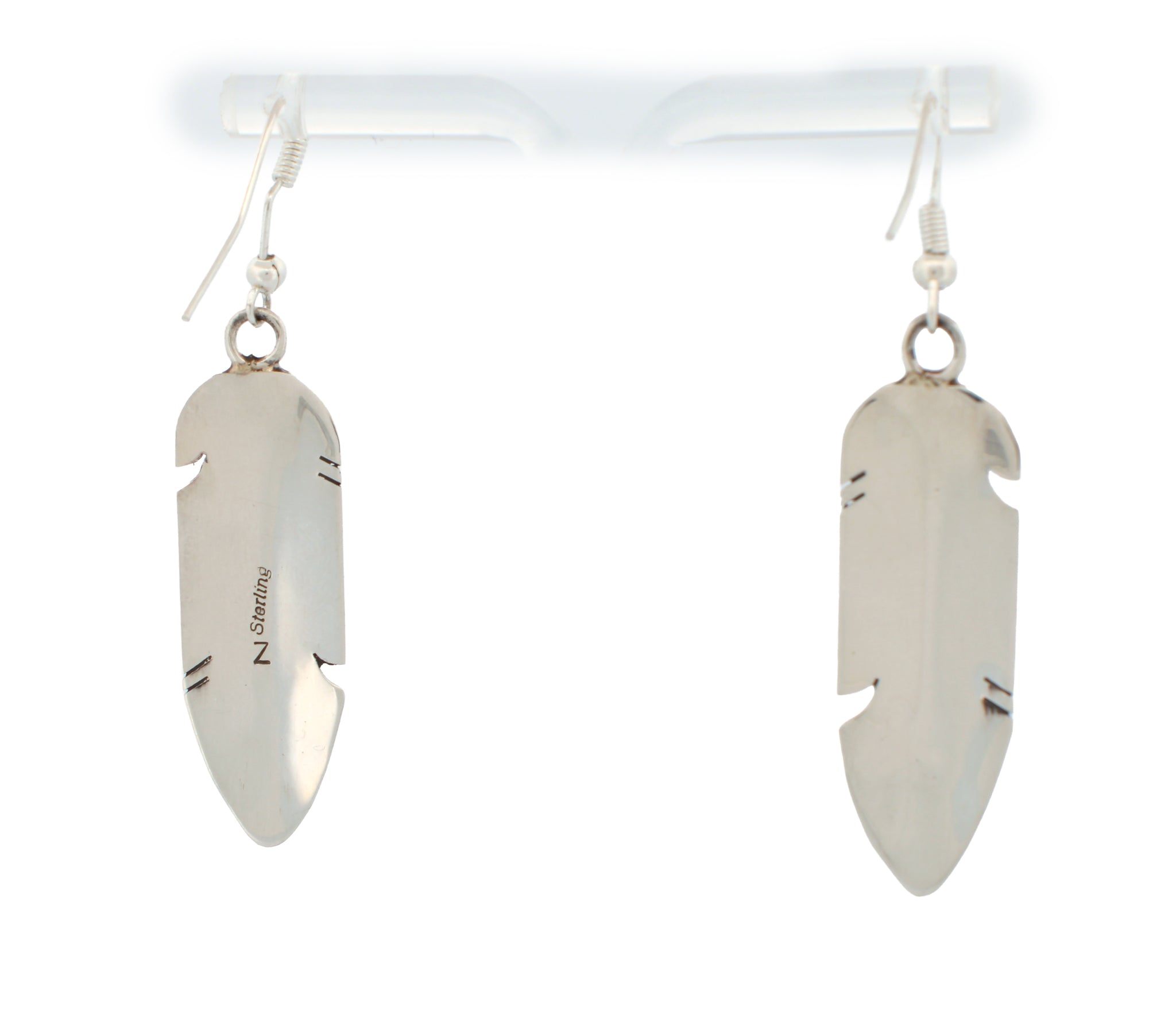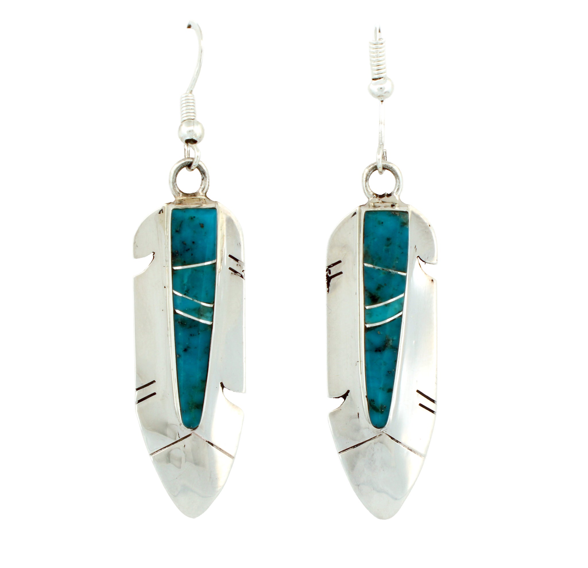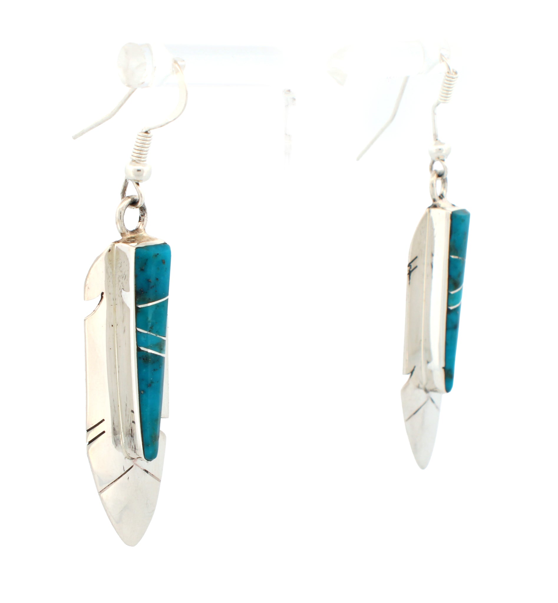 This is a pair of Navajo Native American handcrafted earrings. These feather inspired earrings are created with inlay cuts of Turquoise crafted with Sterling Silver. One setting is signed by the artist noted as N and is stamped Sterling.