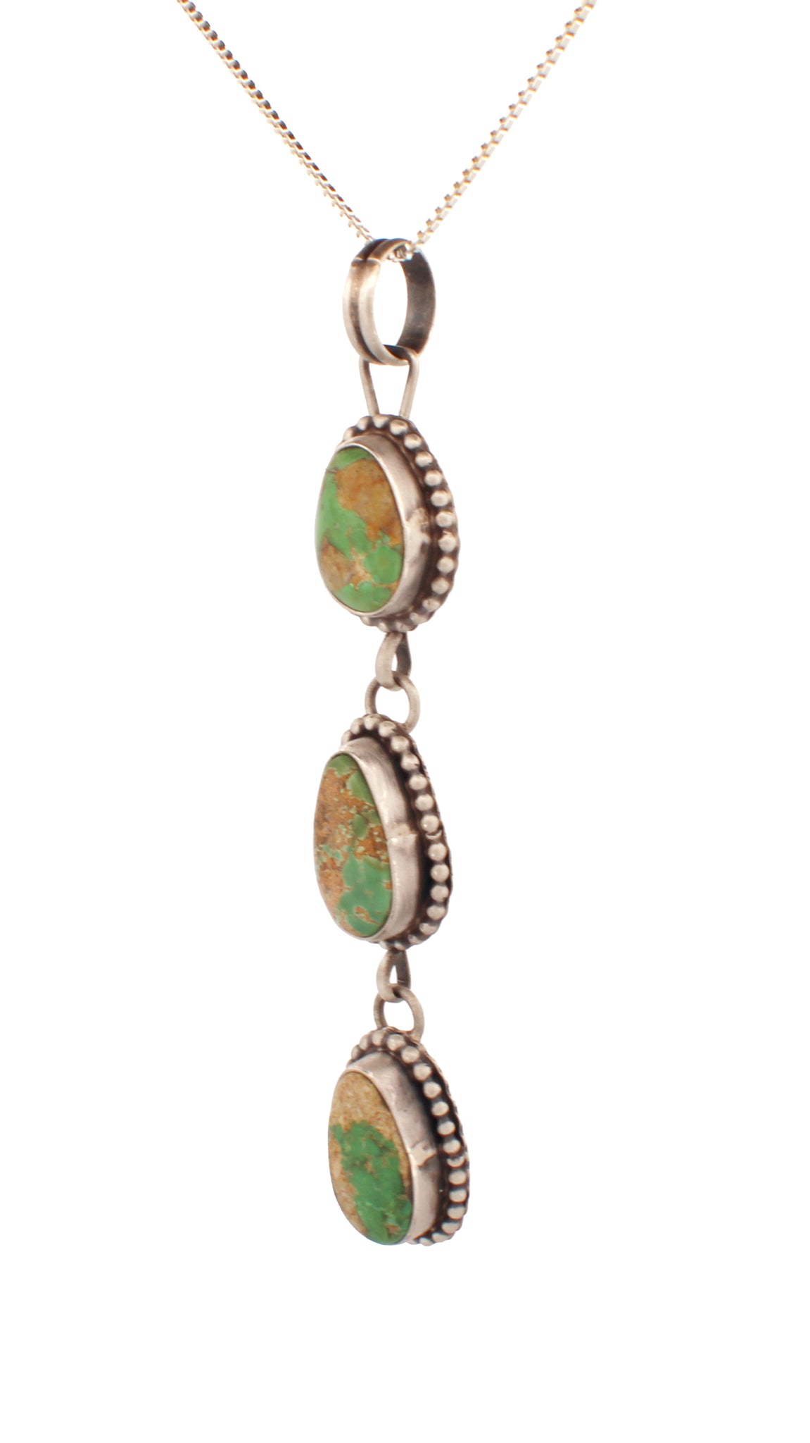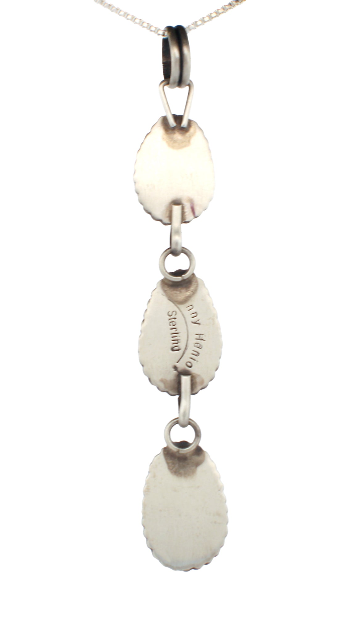 The necklace is a non Native American sterling silver 16 inch box link chain. Should you desire a longer chain, please note at check out that you would like to replace the 16 inch with an 18 inch or 20 inch Sterling Silver box link chain. There is no additional cost for such a request.