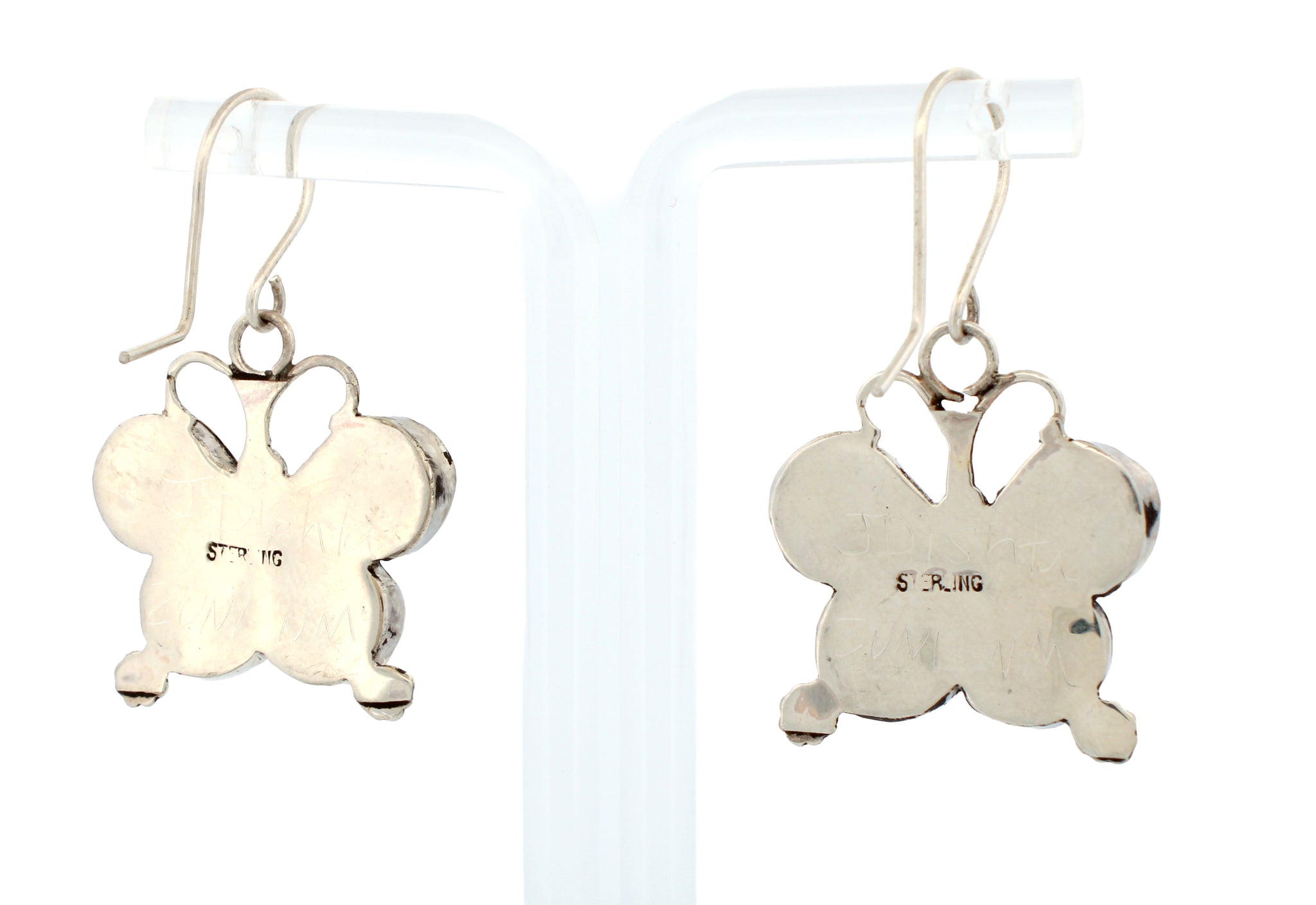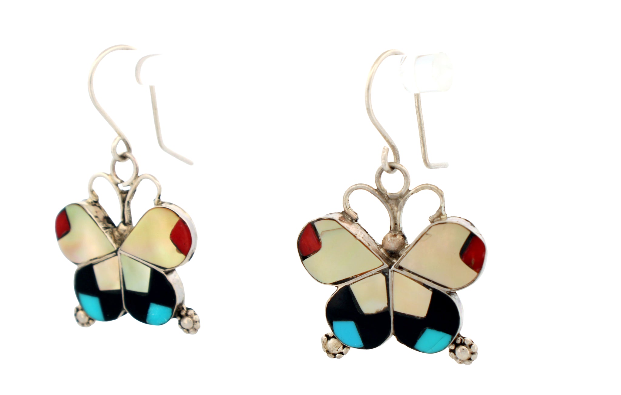 This is a beautiful pair of Zuni handcrafted Earrings by Jolica Dishta. These butterfly inspired earrings are created with inlay cuts of yellow lip mother of pearl, Kingman Turquoise, Red Coral and polished jet all crafted with Sterling Silver.