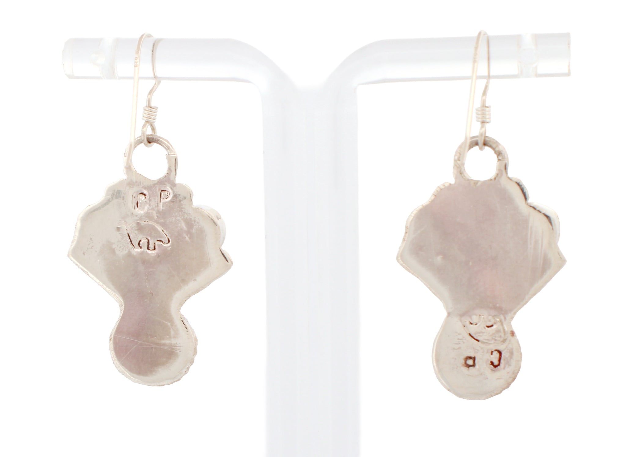 This is a pair of Zuni handcrafted earrings. The earrings are created with Sleeping Beauty Mine Turquoise, Coral, Mother of Pearl and Jet crafted with Sterling Silver. Both settings are signed by the artist on the back noted as CP.