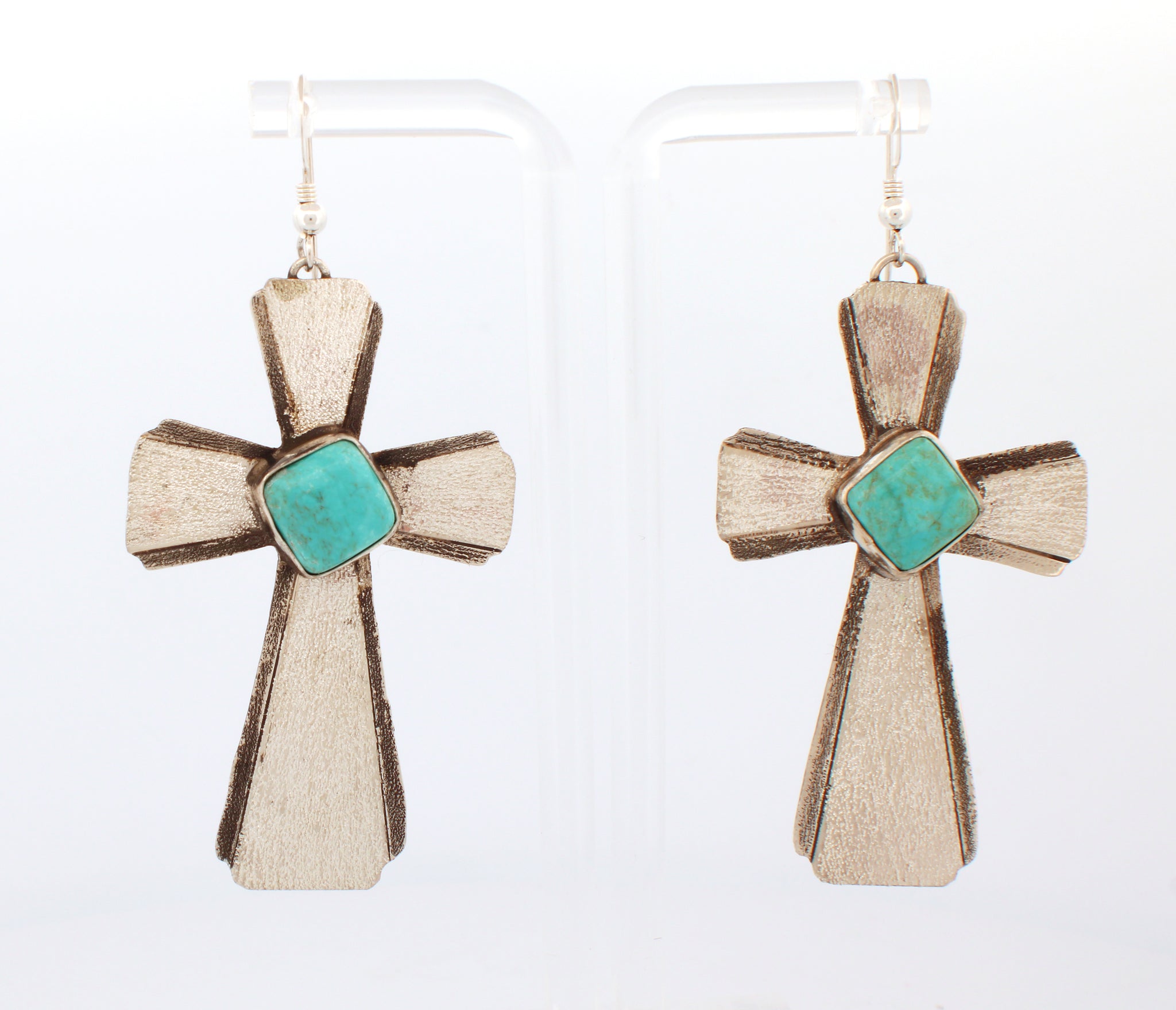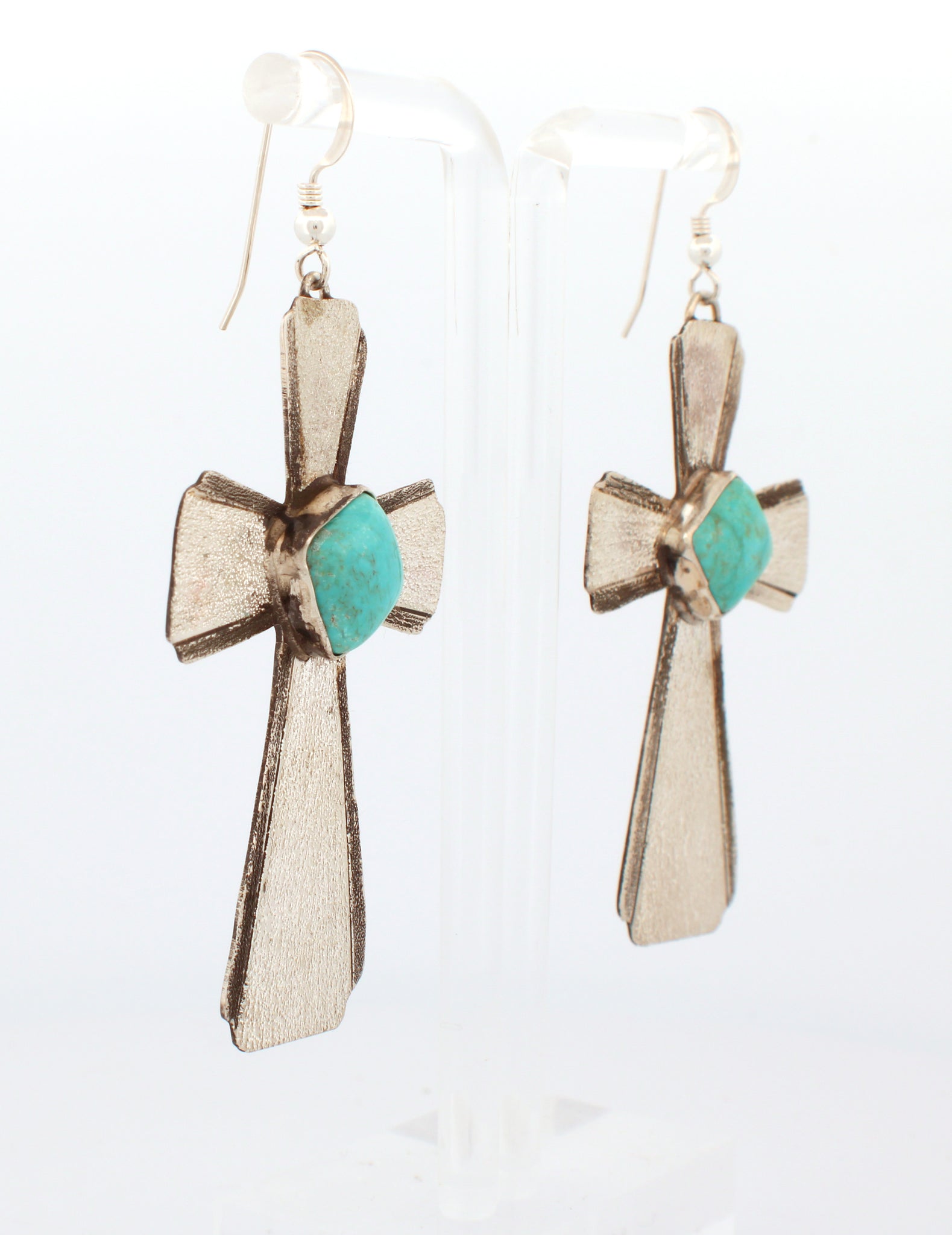 This is a pair of Navajo Native American handcrafted earrings by Dakota Willie. These earrings are created with Compitos Mine Turquoise crafted with Sterling Silver. Both setting are stamped Sterling.