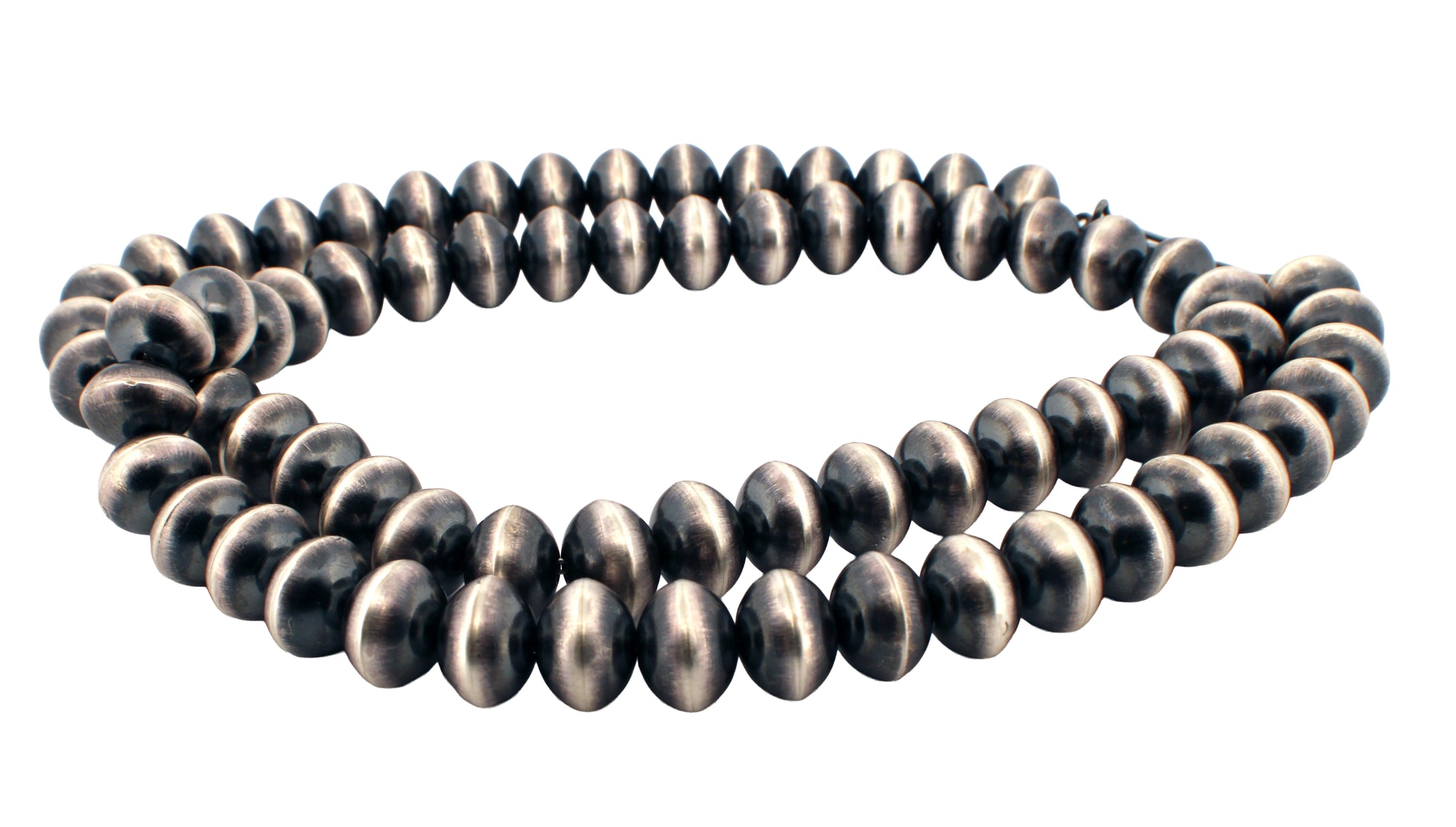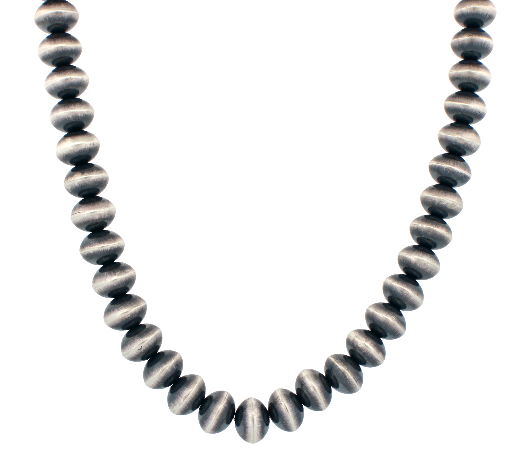 Elevate your collection with this stunning strand of 26-inch, 11.5mm handmade Navajo pearls, meticulously crafted by renowned Navajo silversmith Lilly Yazzie. Each sterling silver bead is individually handcrafted, oxidized, and polished to bring out the timeless beauty and rich tradition of Navajo silversmithing.