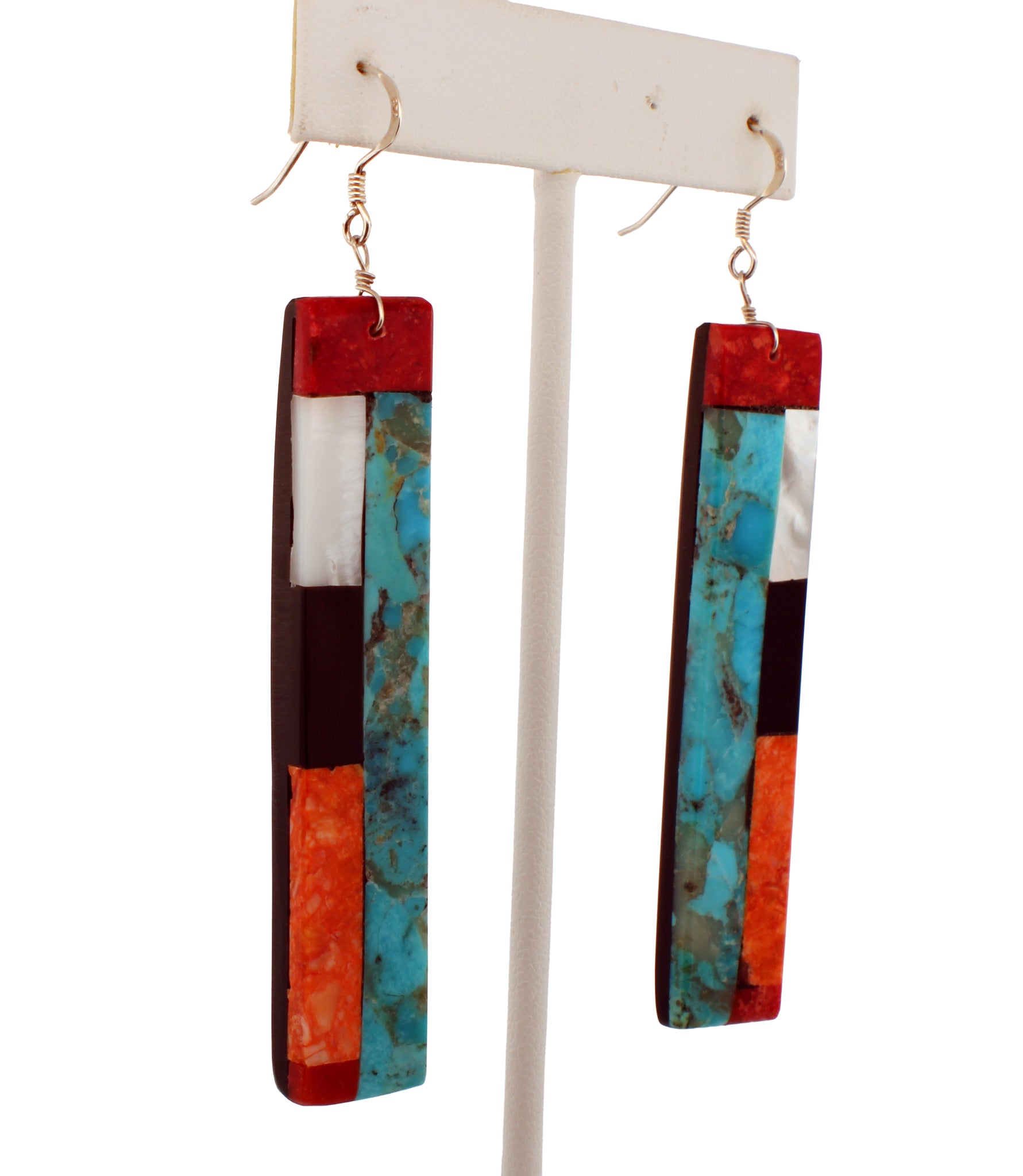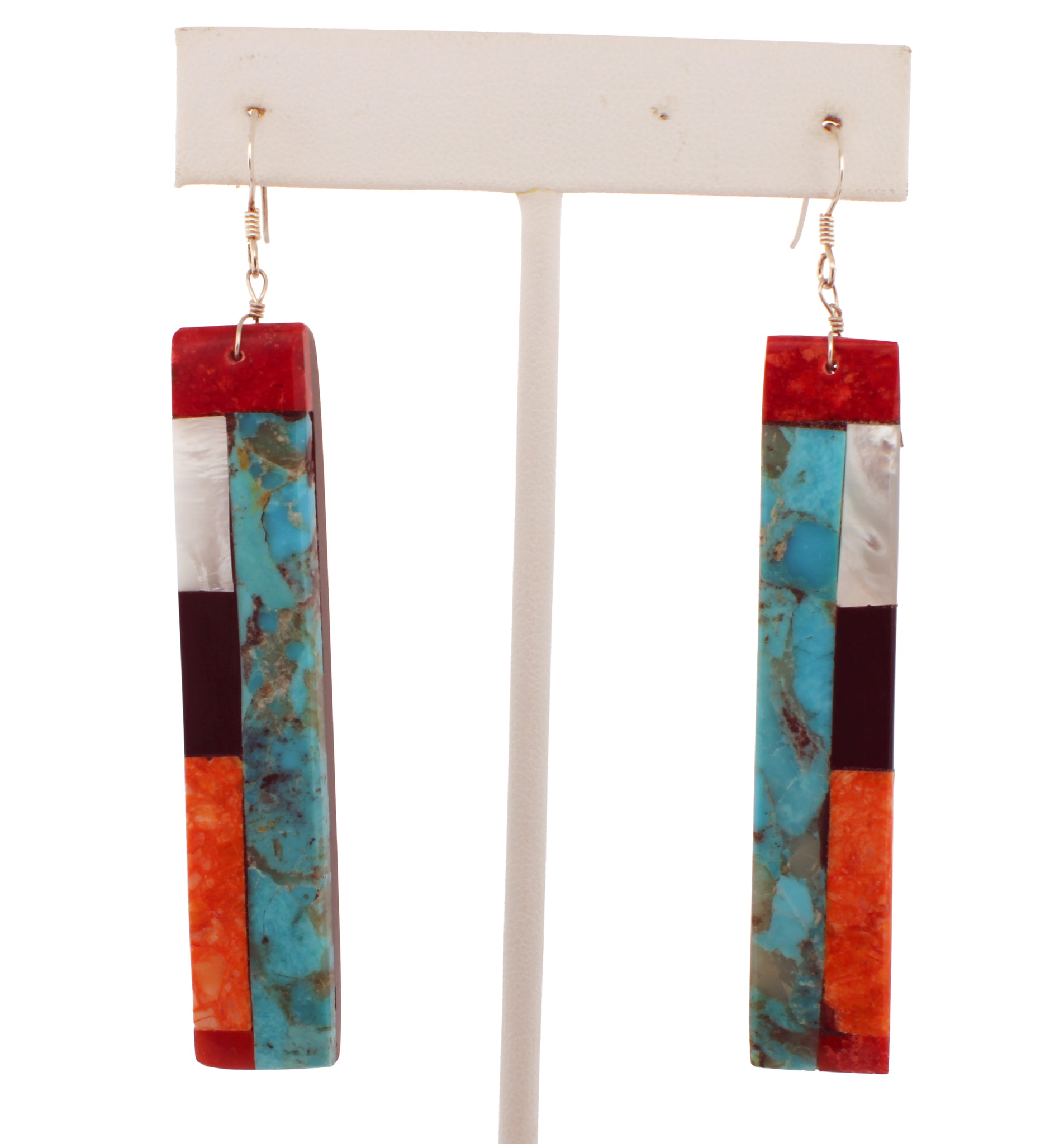 This is a pair of Santo Domingo Earrings Kewa Pueblo. The earrings feature a solid Polished Jet back with inlay cuts of Turquoise, Sponge Coral, Mother of Pearl and Jet. All silver is Sterling Silver.