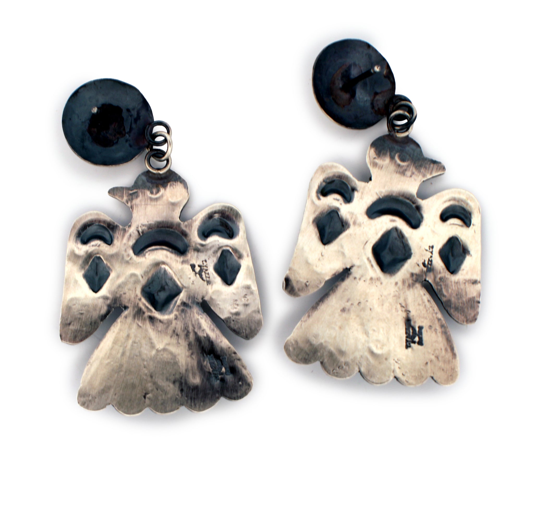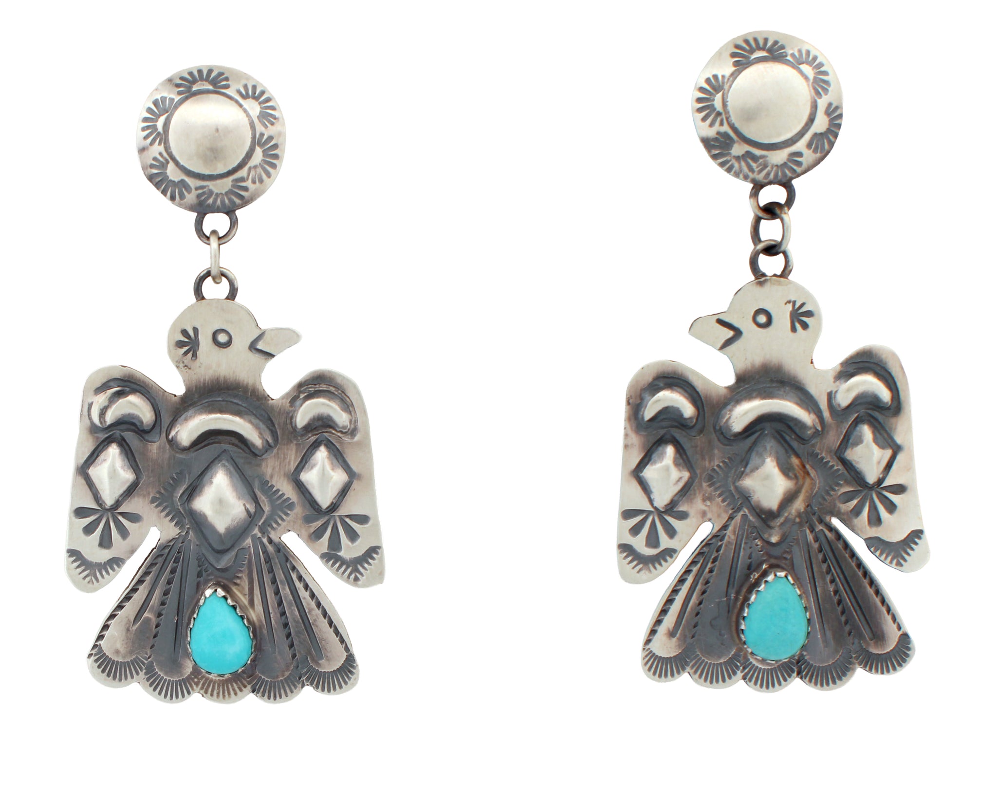 This is a pair of Navajo Native American Handcrafted earrings by Thomas Yazzie. These Thunderbird inspired earrings are created with Kingman Turquoise and repousse and stamped Sterling Silver. Both earrings are signed by Thomas, noted as T Yazzie with his trademark feather stamp and are stamped Sterling.