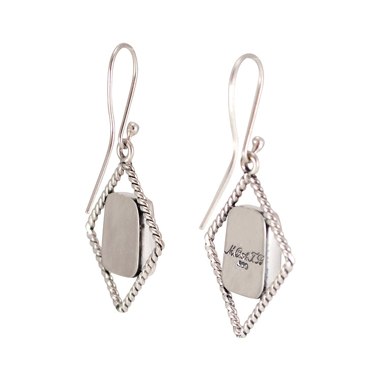 This is a pair of Earrings created by Nahuatl Indian Artist Augustine Torres Beltran. These beautiful earrings are created from Mata Ortiz Pottery Shards that have been crafted in .950 Sterling Silver. The reverse of one setting is signed MOATB for Mata Ortiz and the Artist Initials and is also stamped .950.