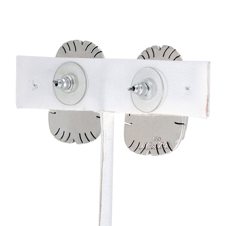 This is a pair of Earrings created by Nahuatl Indian Artist Augustine Torres Beltran. These beautiful earrings are created from Mata Ortiz Pottery Shards that have been crafted in .950 Sterling Silver. The reverse of one setting is signed MOATB for Mata Ortiz and the Artist Initials and is also stamped .950.