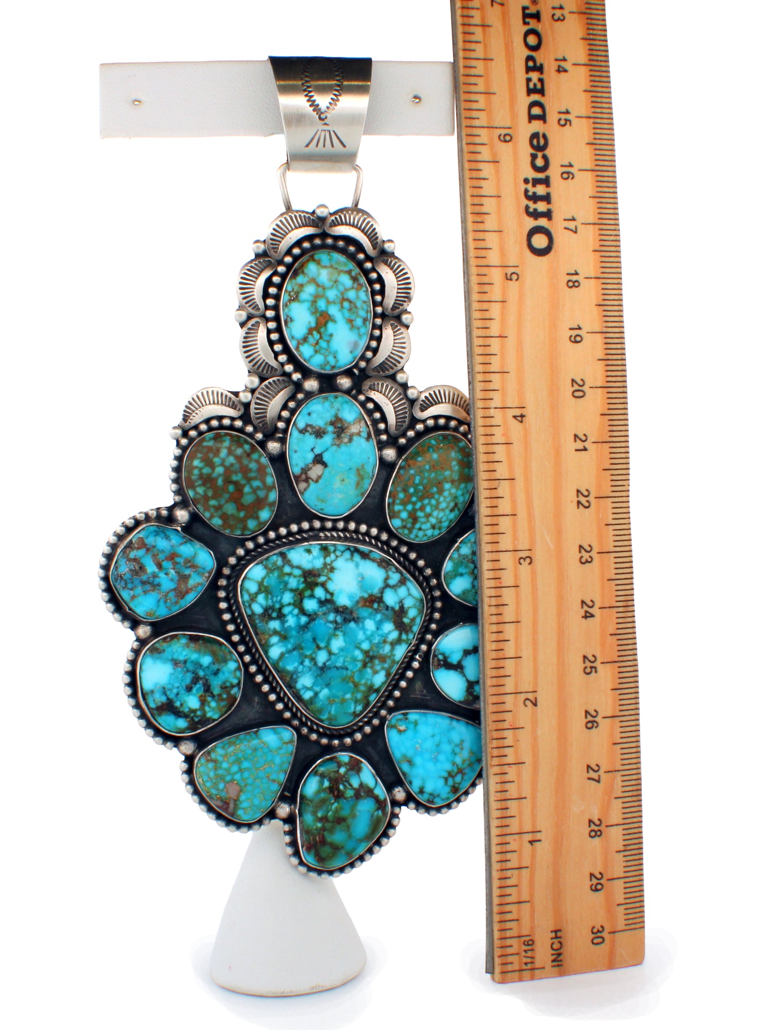 The back of the pendant is stamped “Sterling” and hall-marked with Etta’s signature “E” — an unmistakable mark of authenticity and quality. This piece is not just jewelry—it's a wearable story of heritage, stone and spirit. This magnificent piece measures 5 3/4 from the top of the bale to the bottom of the pendant and is 3 1/4 inch wide at the widest point. The bale can accommodate up to a 17mm bead. Total weight of this piece is 106.9 grams.